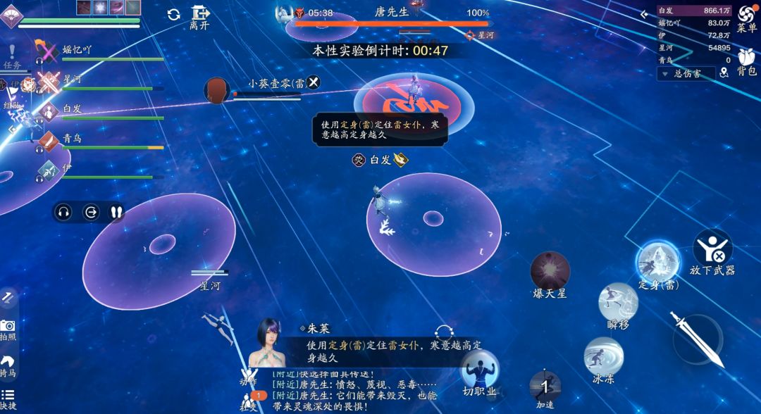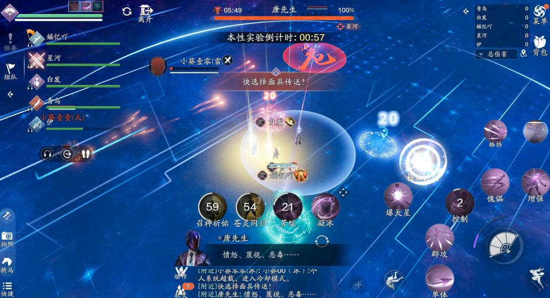 在唐先生释放完红圈技能后,所有人立即散开,根据面具的颜色技能进行躲避。同时拿盾的少侠往唐先生脚下释放水龙卷,拿剑的少侠及时将水龙卷冻住。