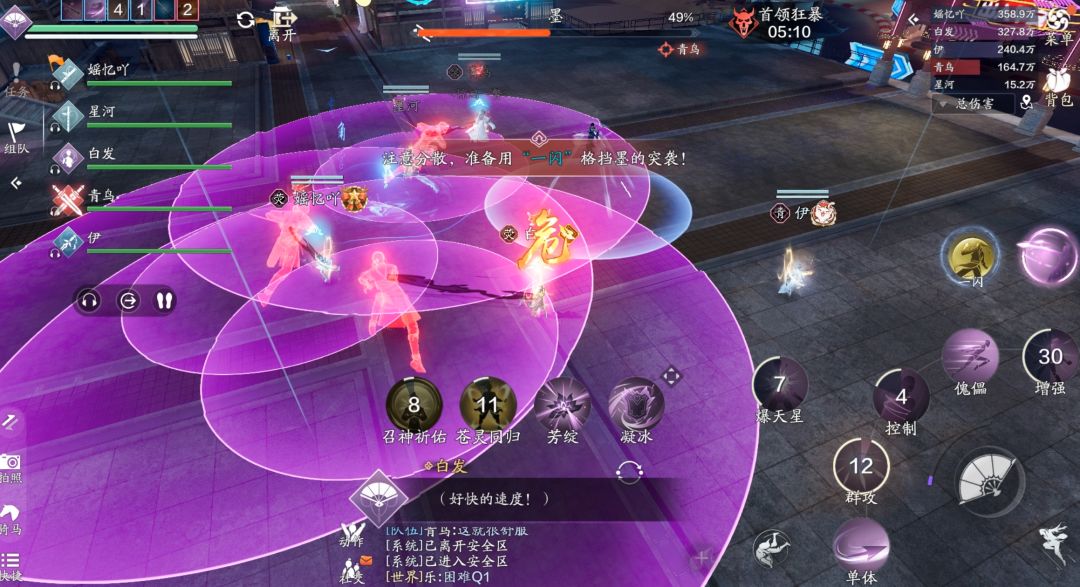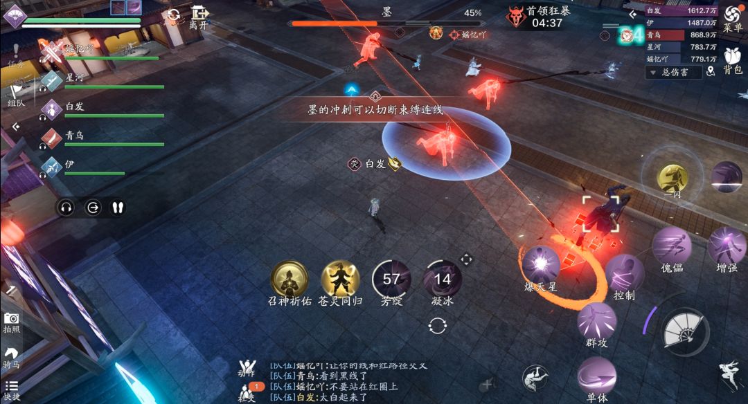 分身的紫圈消失后,少侠身上的黑线依旧存在,此时首领会再次点名一位少侠发动冲锋技能,首领与该名少侠之间会有一条红色的矩形技能提示,少侠需要利用武士的冲刺技能切断束缚的黑线。并且被点名的少侠记得不要乱走,找准黑线,在矩形技能读条快结束的时候使用“一闪”进行格挡。