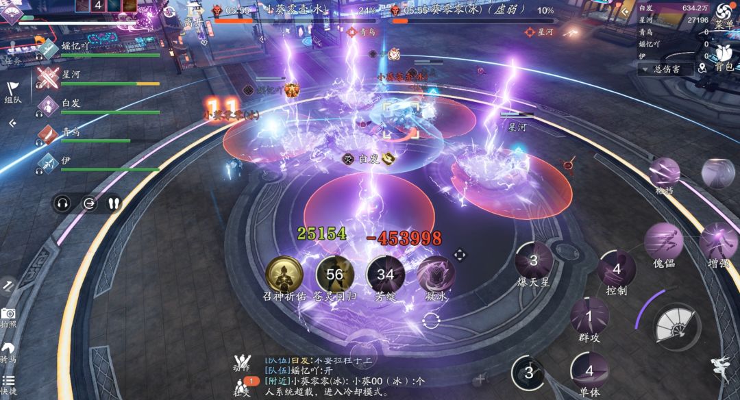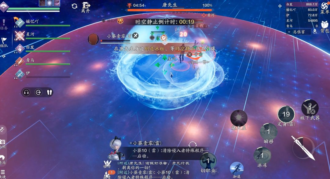 将冰柱都打掉后,首领如果在人群中释放技能,我们应当采用“同向阻断”的方法抵消它的技能,当首领双手举起释放全屏范围技能的时候,治疗的大抬要及时使用,并且万象技能的护盾也记得开启,因为这个技能无法阻断。