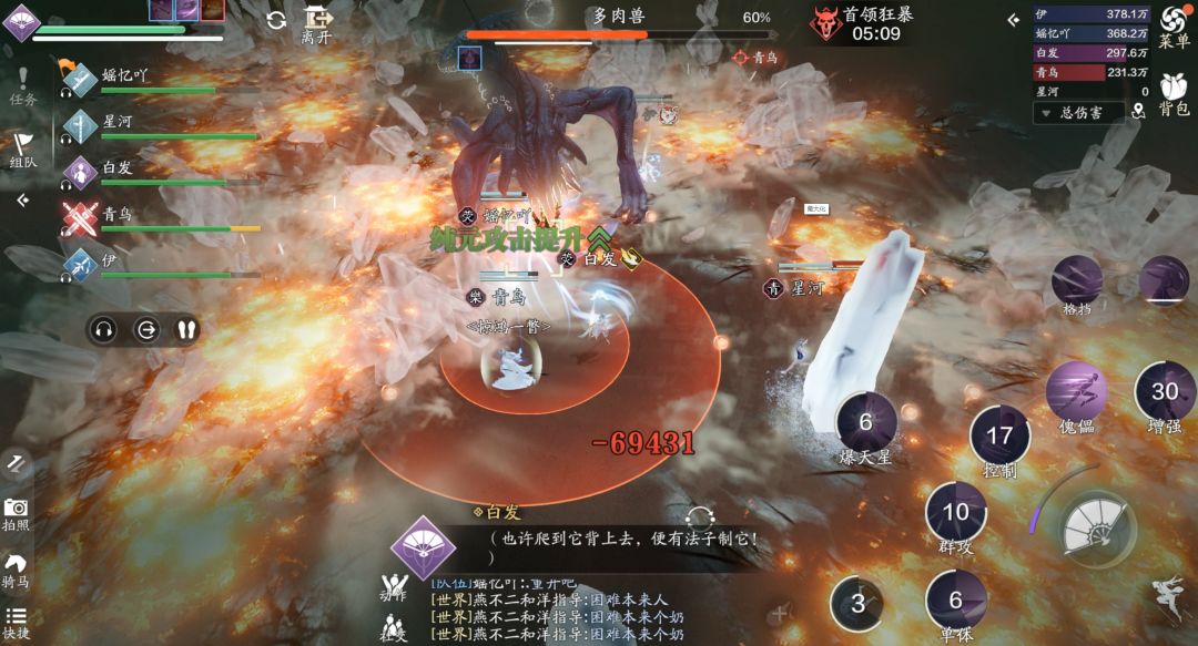 第二阶段的机制一样,以最快的速度将首领的定力破除,并且攀登到它的背上去打冰柱。这里要注意,首领多了一个技能机制,每次破除定力之前会召唤满地的火圈,少侠站在火圈内就会收到持续的伤害,一定要注意,不要给治疗增加压力。
