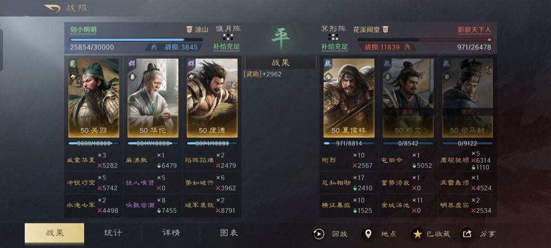 我利用关羽、华佗和庞德摆出偃月阵,半场时间团灭了对面夏侯惇、司马懿和邓艾的队伍,而且司马懿还是搭配了五雷轰顶的。具体的细节部分,都被整理在了下文的段落中。