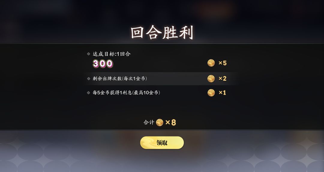 游戏的目标则是需要在4次出牌的过程中,获得牌桌左上角要求的目标分数,达到分数即可进入下一回合,否则将被淘汰,淘汰后可获得一定数量的“闲情令”。