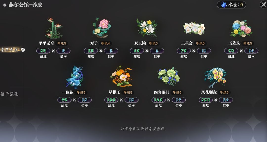 值得注意的是,花色组合可以使用“燕尔养花壶”培养,来提高等级,提高卡牌组合等级后,可获得更高的甜度和倍率。