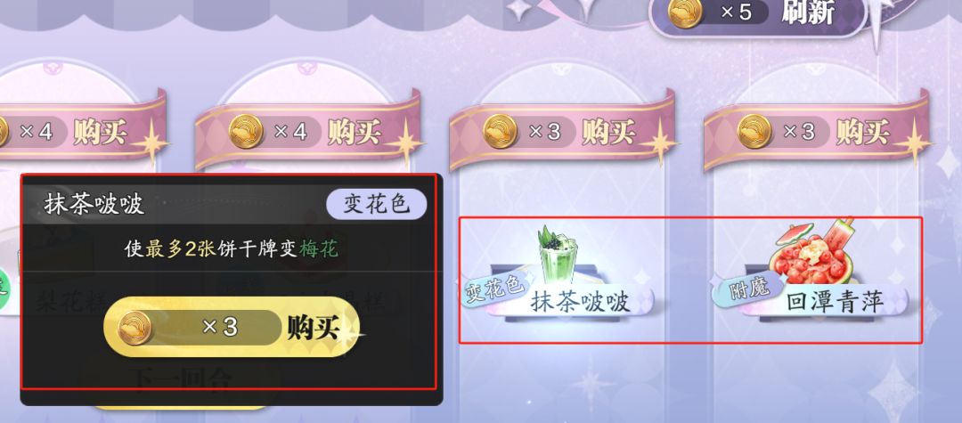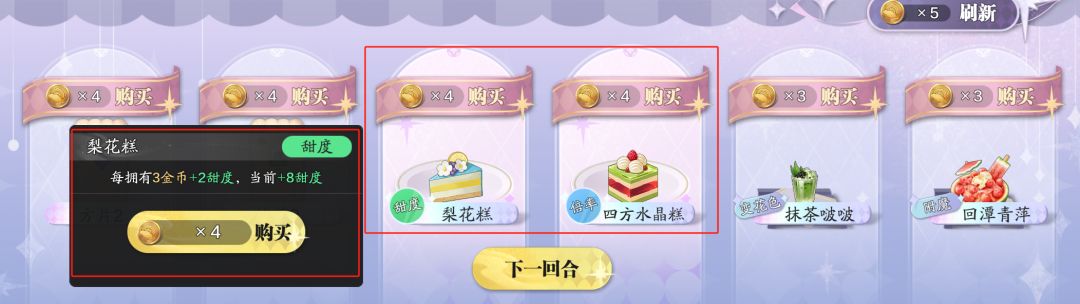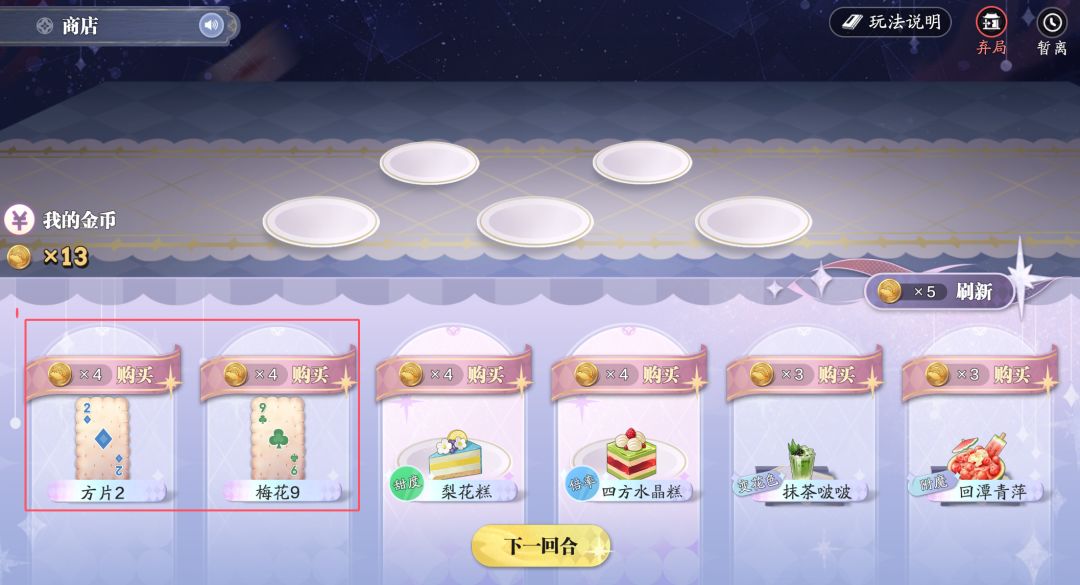 并且在下一局开始前,可以在刷新的商店中购买饼干、蛋糕(甜品)、饮品三种类型的道具,商店中如果没有自己想要的道具,可以花费5金币刷新一次,一共可以刷新5次。其中,饼干可用于丰富卡组,比如一直购买红桃花色,玩到后面,卡牌中红桃花色的卡牌就会更多;