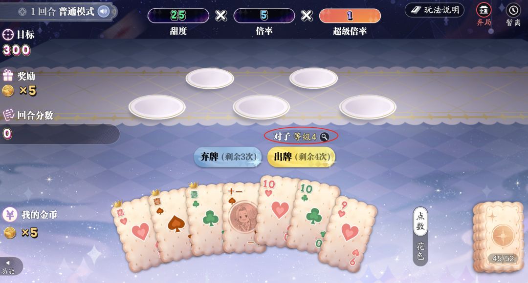 初始状态下,每回合出牌次数为4次,每次最多出5张牌,弃牌次数为3次。