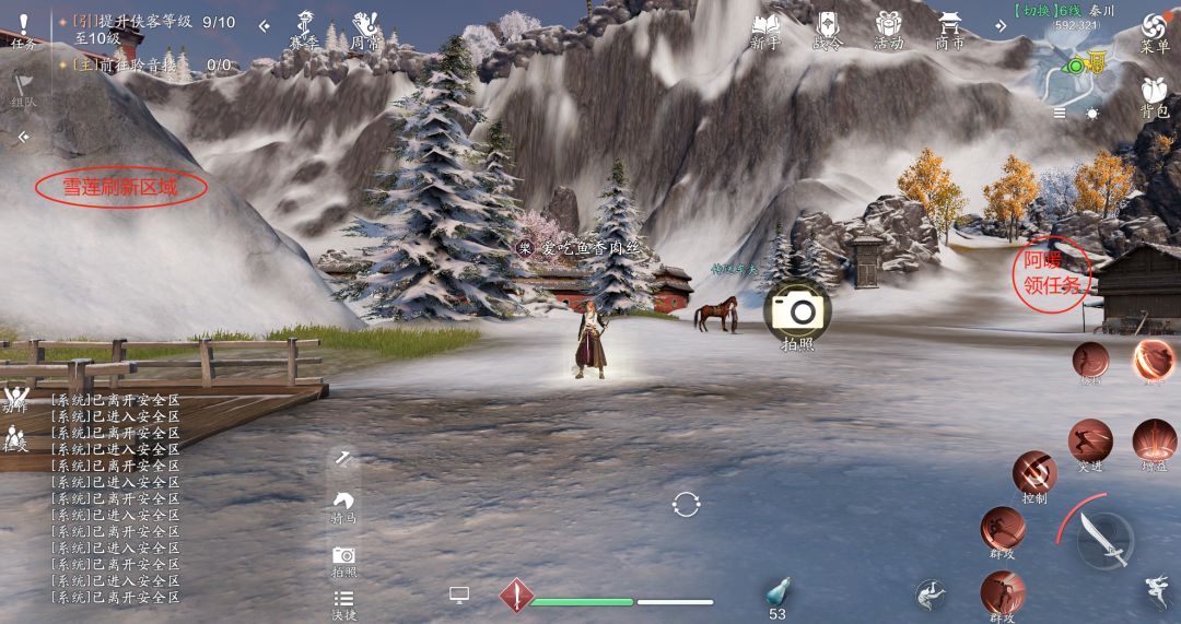 在秦川暴风雪天气,少侠们可以来到这附近,找NPC阿暖接取限时任务,用雪球抓捕雪狐。成功抓捕雪狐后,有概率可获得永久的雪狐宠物。而在打卡点附近,暴风雪天气出现时,也会刷新雪莲,采集到的完整雪莲,可用于制作金色品质的菜肴,少侠们不要错过。