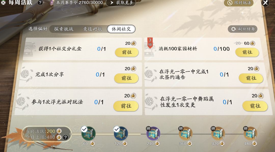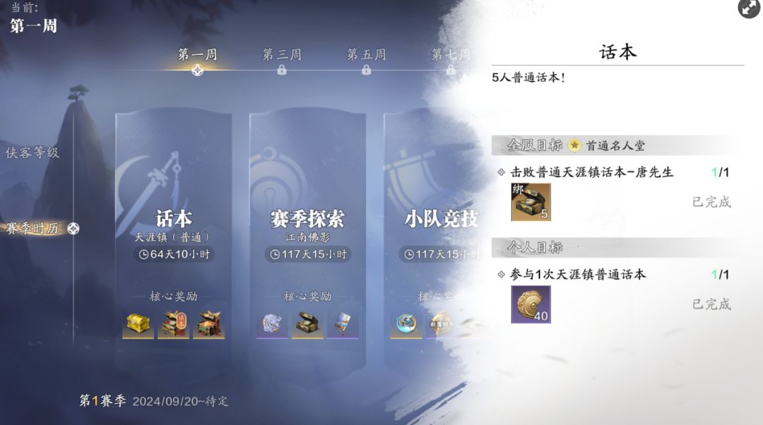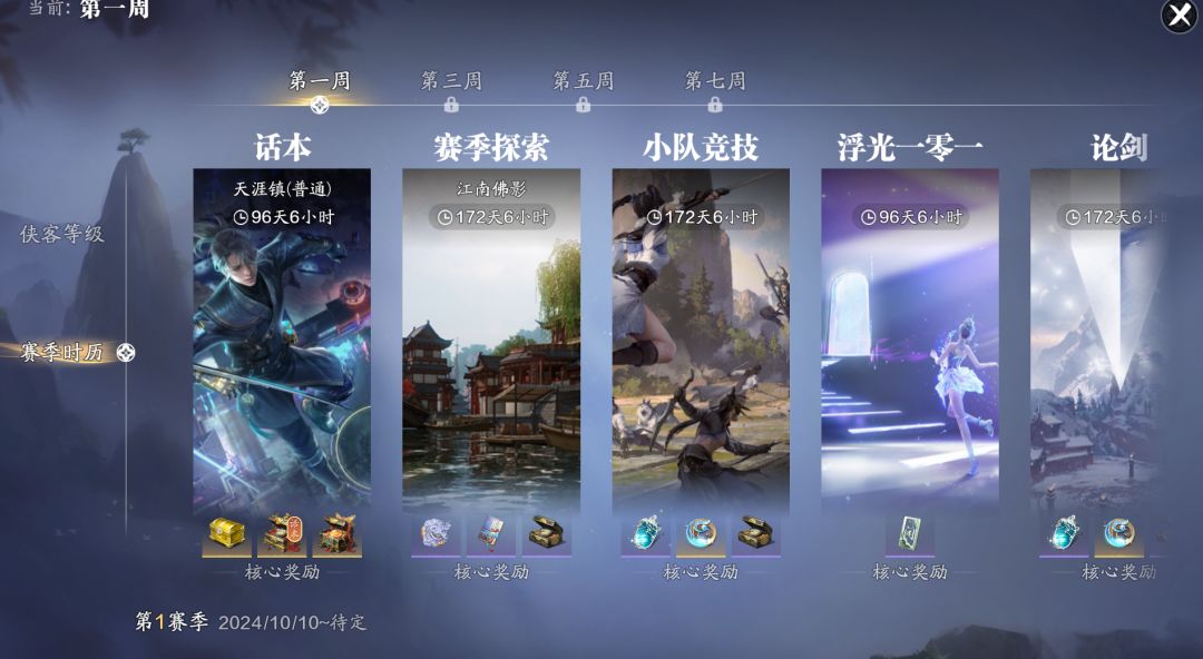 赛季时历任务,该任务会随着赛季开放的时间来解锁下一个阶段的玩法内容,任务类型有话本、赛季探索、小队竞技、休闲玩法、论剑、帮会玩法等等。