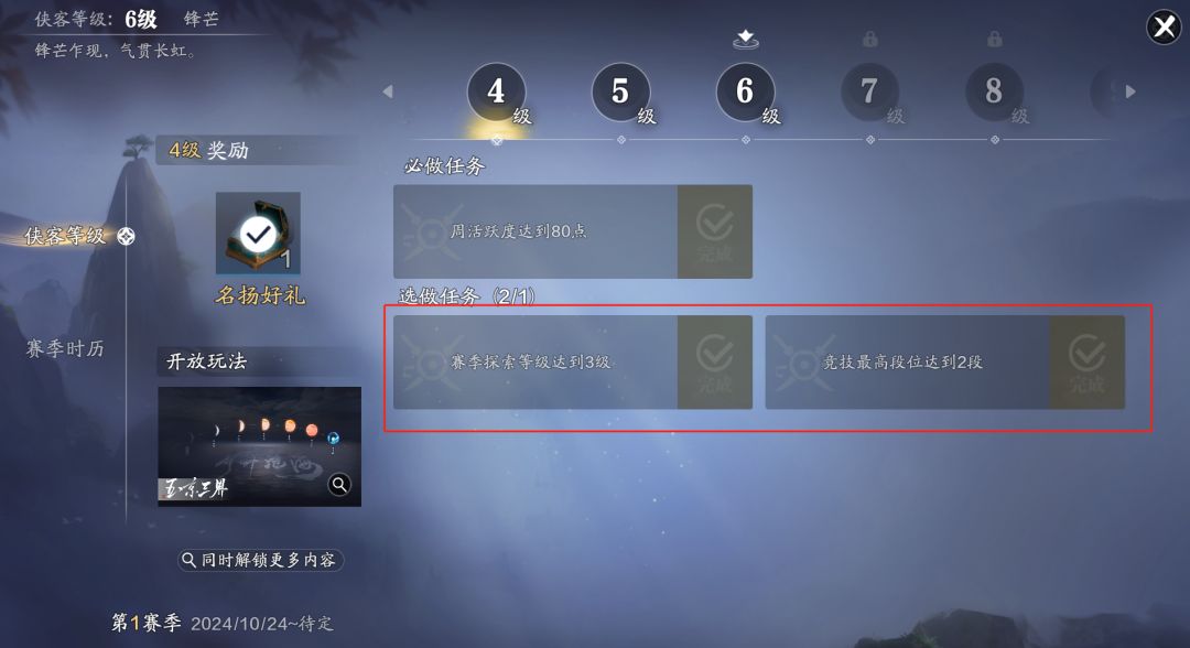 点开赛季按钮之后,会发现有两个选项“侠客等级”与“赛季时历”,侠客等级就是少侠的等级,少侠想要升级就必须完成当前等级的任务,才可以解锁下一级。