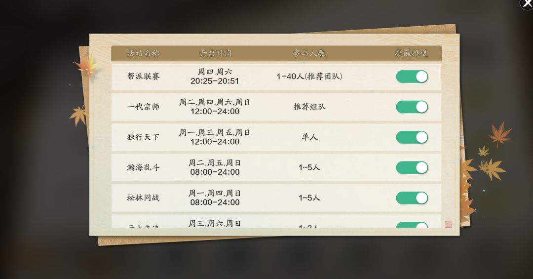 另外在周常任务的右上角,有限时玩法图标。点开之后,我们可以看见赛季服每周的限时玩法开启时间,少侠记得勾选提醒推送,不要错过!
