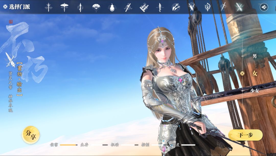 在选取好大区之后,就进入了选择门派界面,除了最新的门派不朽者之外,整体的UI也发生了变化,每个门派选择由原先的左边变成了上方,少侠可以根据自己的喜好选择门派。