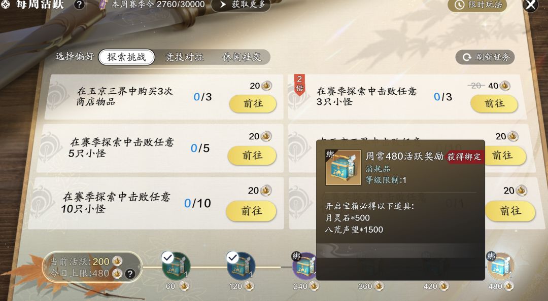 “探索挑战”主要针对喜欢世界探索任务以及打玉京三界的少侠。