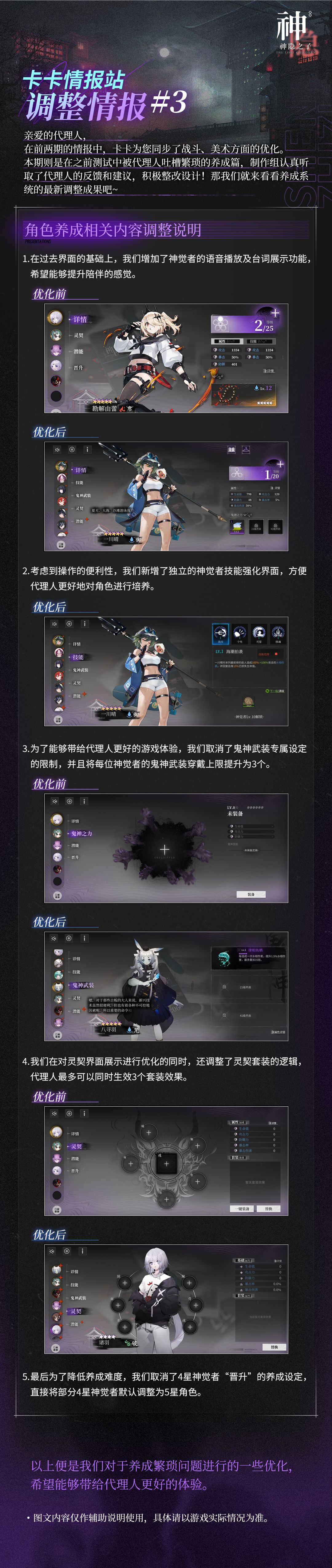 亲爱的代理人,在前两期的情报中,卡卡为您同步了战斗、美术方面的优化。本期则是在之前测试中被代理人吐槽繁琐的养成篇,制作组认真听取了代理人的反馈和建议,积极整改设计!那我们就来看看养成系统的最新调整成果吧~