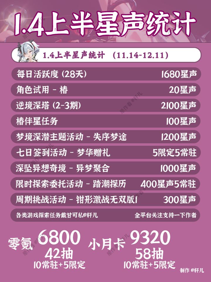 轩儿今天给大家整理了鸣潮1.4上半的活动日历和星声统计