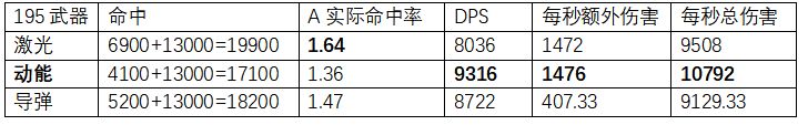 搭配评分195的武器,命中分别是:激光武器命中6900;动能命中 4100;导弹命中5200