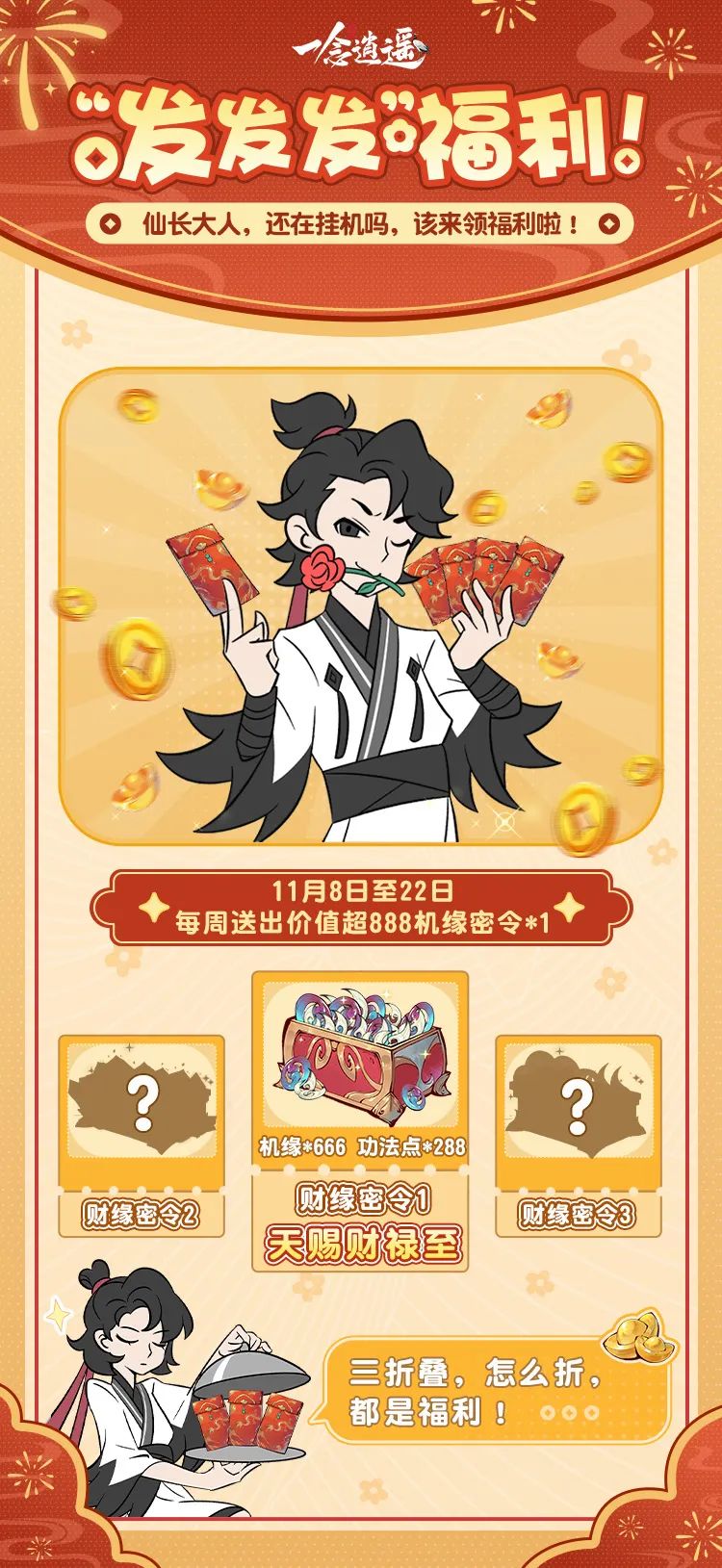 活动中财宝满堂,活动外小师妹也准备了丰厚福利!11月8日~22日期间,我们将每周在公众号送出1份价值超888机缘的密令,包含机缘、功法点、铸器石等修炼资源,借此良机与大家一起共聚财气,迎接滚滚财缘!