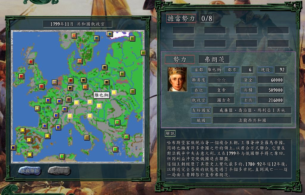 看到拜仁,德甲的球迷们必须沸腾了。不过三国志11欧陆版拼的可不是脚下功夫,而是战略眼光。虽然拜仁在前期是比较安全的,跟萨克森、尼德兰等公国都有不错的关系,不过随着法兰西和普鲁士的逐步做大,之后必定难免一战。拥有14块经济区的拜仁,特产精锐火枪兵,由连挫拿破仑的卡尔大公亲自镇守。毫无疑问,卡尔大公亦是弗朗兹一世最后的底牌!