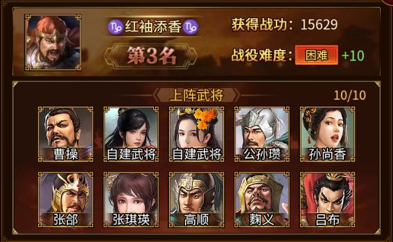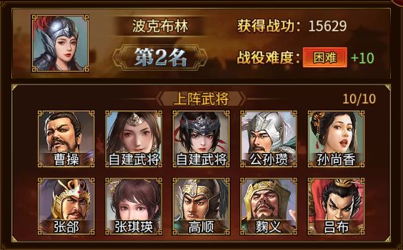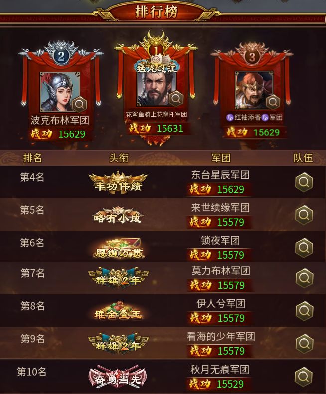 在本期下邳之战中荣登TOP10的勇士们依次是:花鲨鱼骑上花摩托、波克布林、红袖添香