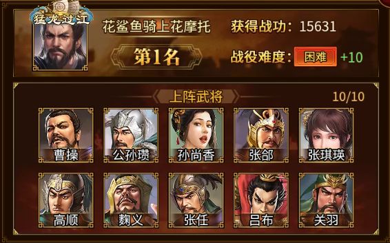 成功荣登本期下邳之战榜首的是 花鲨鱼骑上花摩托 军团,以 15631 的优异战功位居第一,且再次突破极限,恭喜!