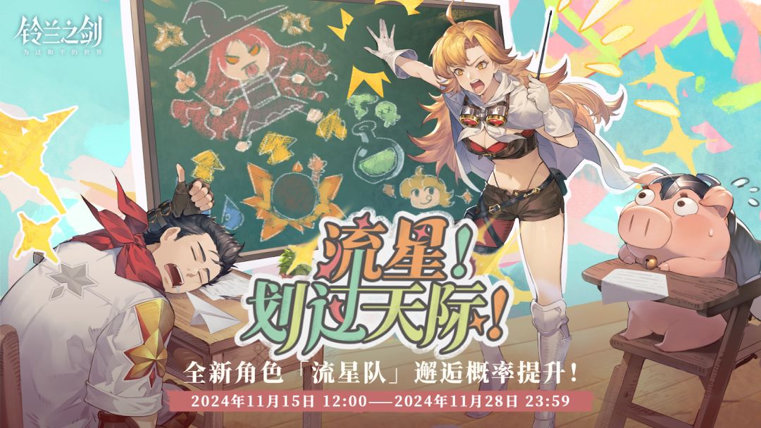 「流星!划过天际!」初遇限时邂逅将于 2024/11/15 12:00 - 2024/11/28 23:59 开启,全新传说角色「流星队」邂逅获取概率将大幅提升!