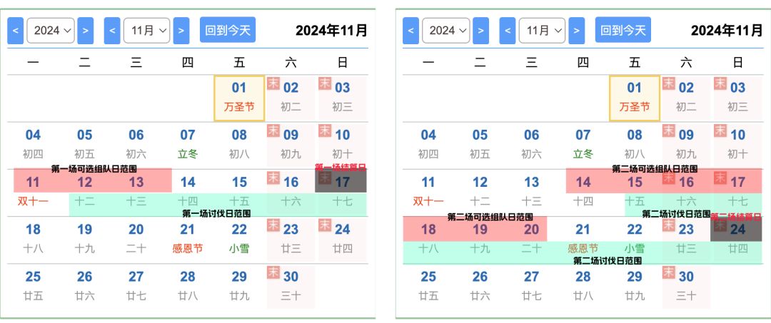 如下图,红色标记为组队日范围,绿色为讨伐日范围,黑色为结算日。