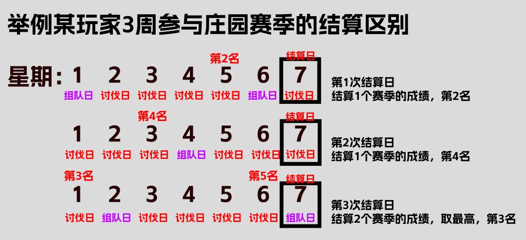 每周一 0:00 到周日23:59为固定结算期,结算期内同一个玩家若有完成多个赛季,则结算最高名次。具体如下图。老镇猜想,这个玩家在第三周周1已经获得了第3名的成绩,后面一赛季还可以帮助萌新拉拉排名呢。