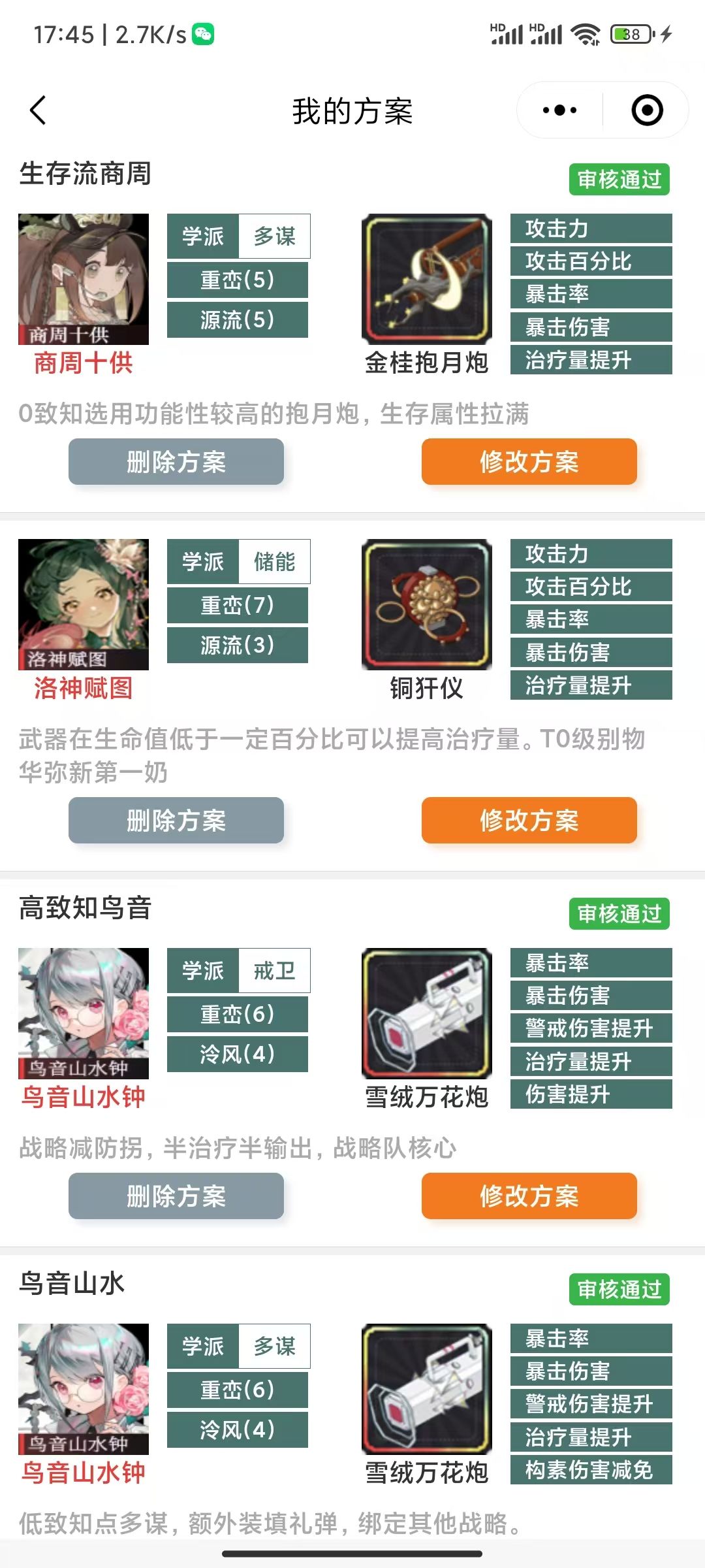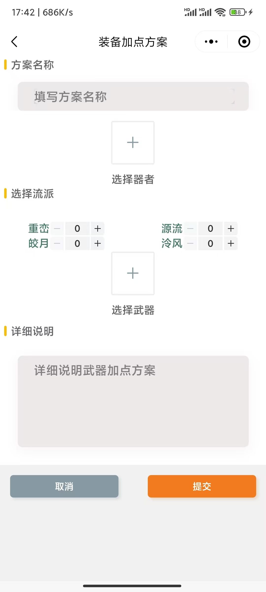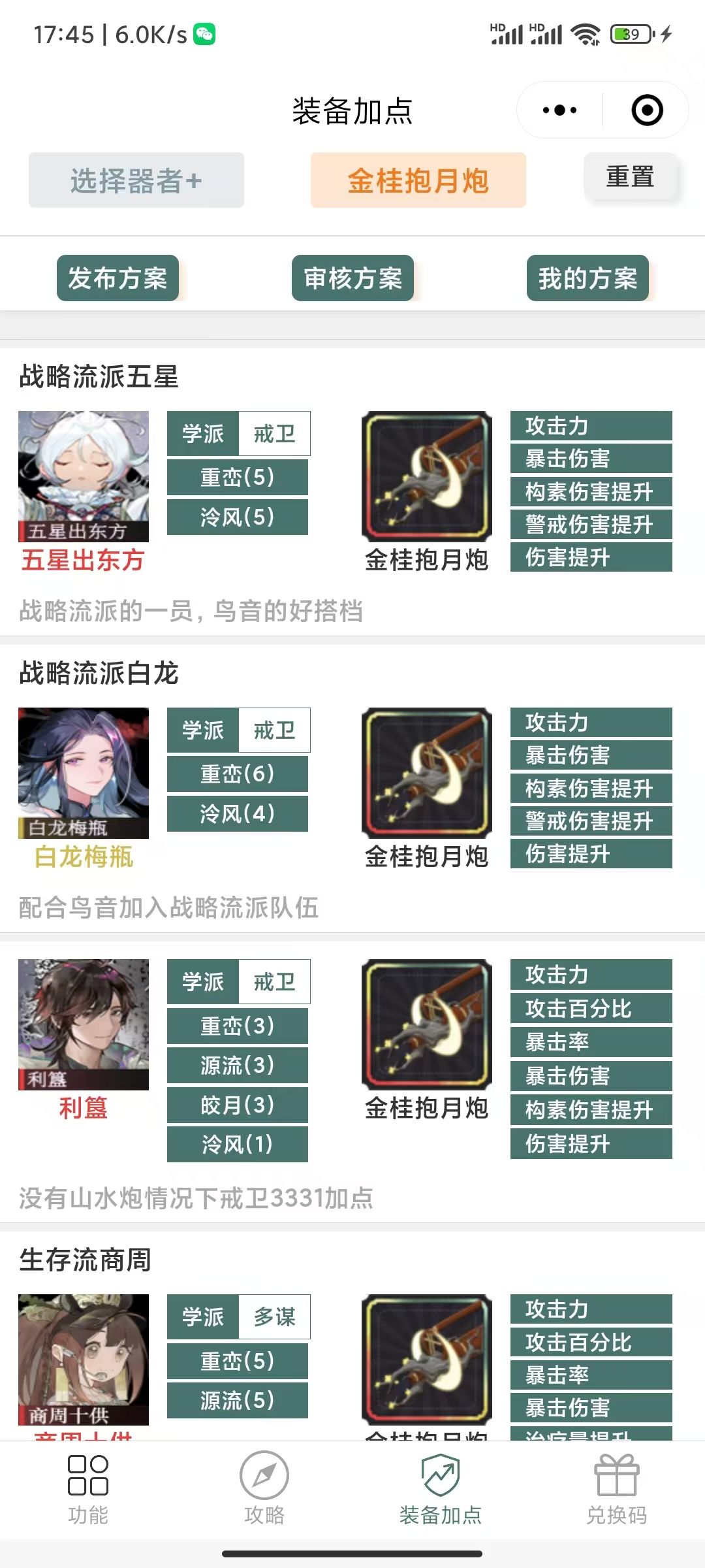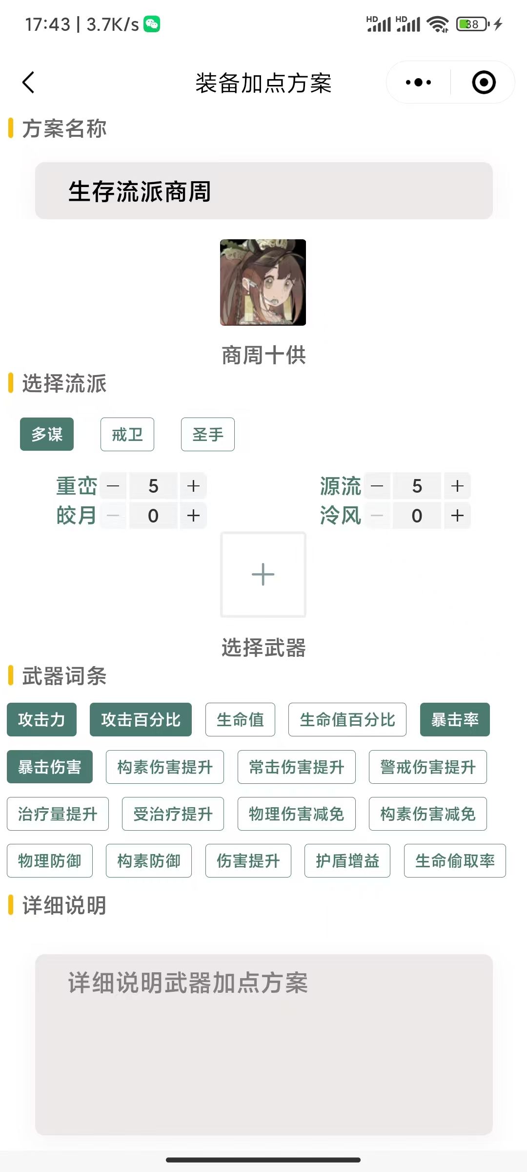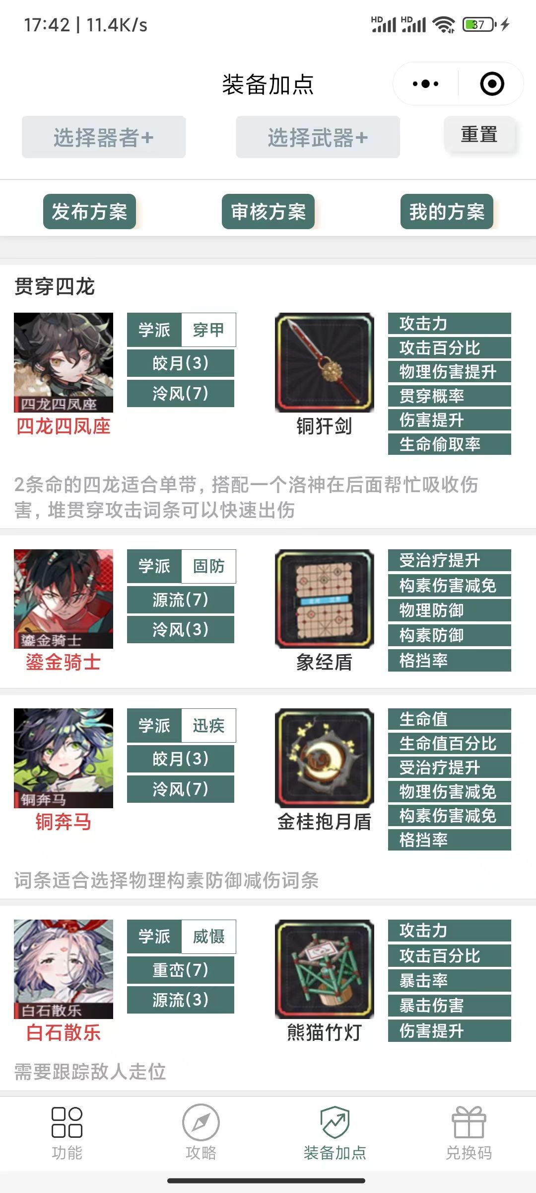 个人的力量还是太小了,如果只有作者一个人来发布方案,难免有一家之言,不合所有人口味的问题出现,所以作者写了发布方案这个功能,欢迎各路大佬发表自己钟意的装备加点方案。器者武器重复,加点和词条有自己的理解也可以发布出来,后续通过玩家的点赞可以让优秀的方案排序靠前,可以让像作者这样的萌新玩家们可以找到更好的武器培养方案捏