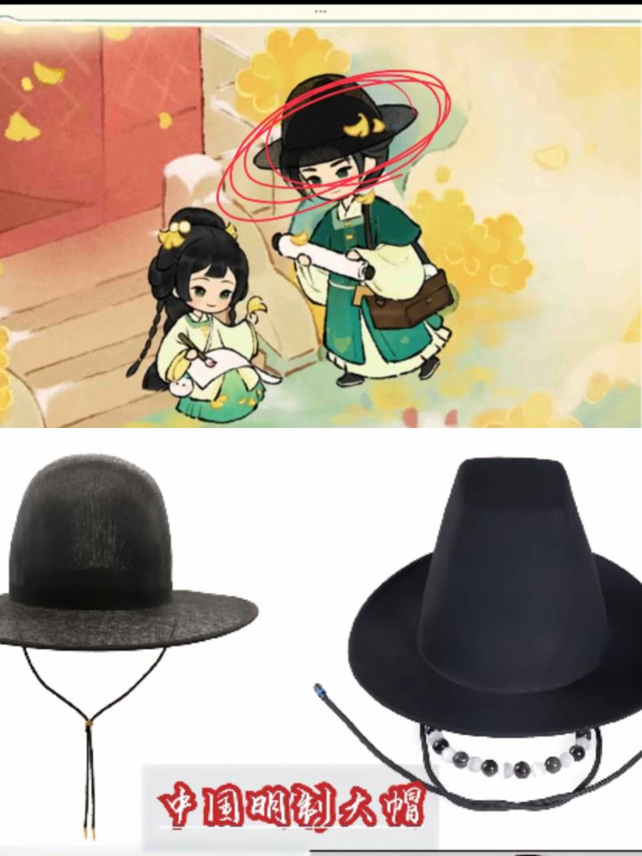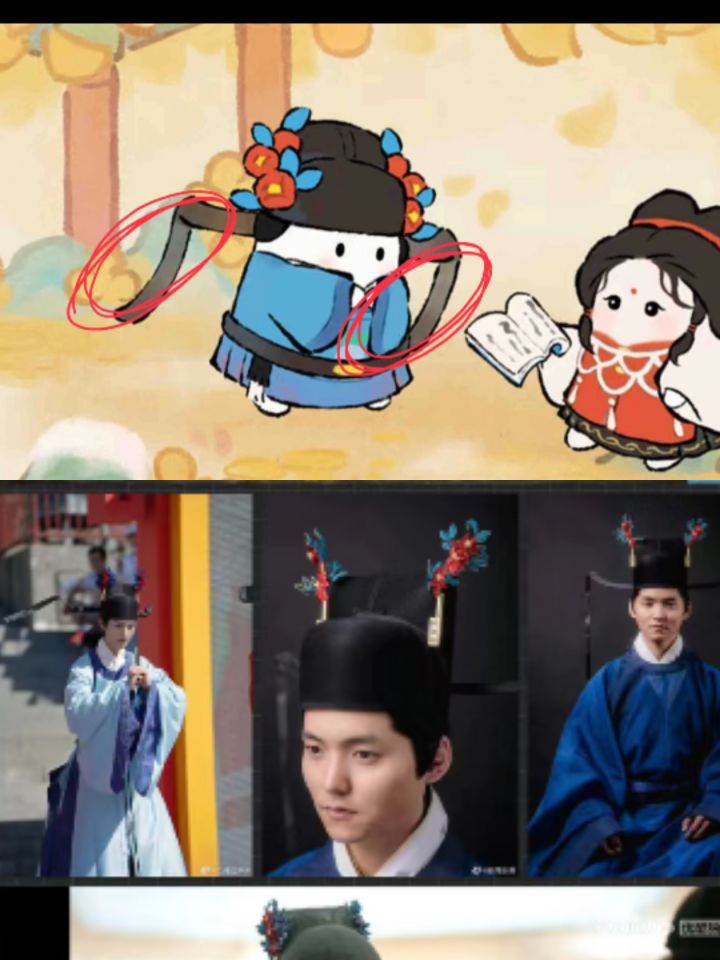 下期建筑是故宫,明代所建,所以这次扶光带的是明制大帽,而福来是明代科举中进士的官帽进士巾:如今乌纱帽之制。顶微平,展角阔寸余,长五寸许,系以垂带,皂纱为之。簪翠叶绒花,其上有铜牌,鈒“恩荣宴”三字。(福来只有簪花没有铜牌)