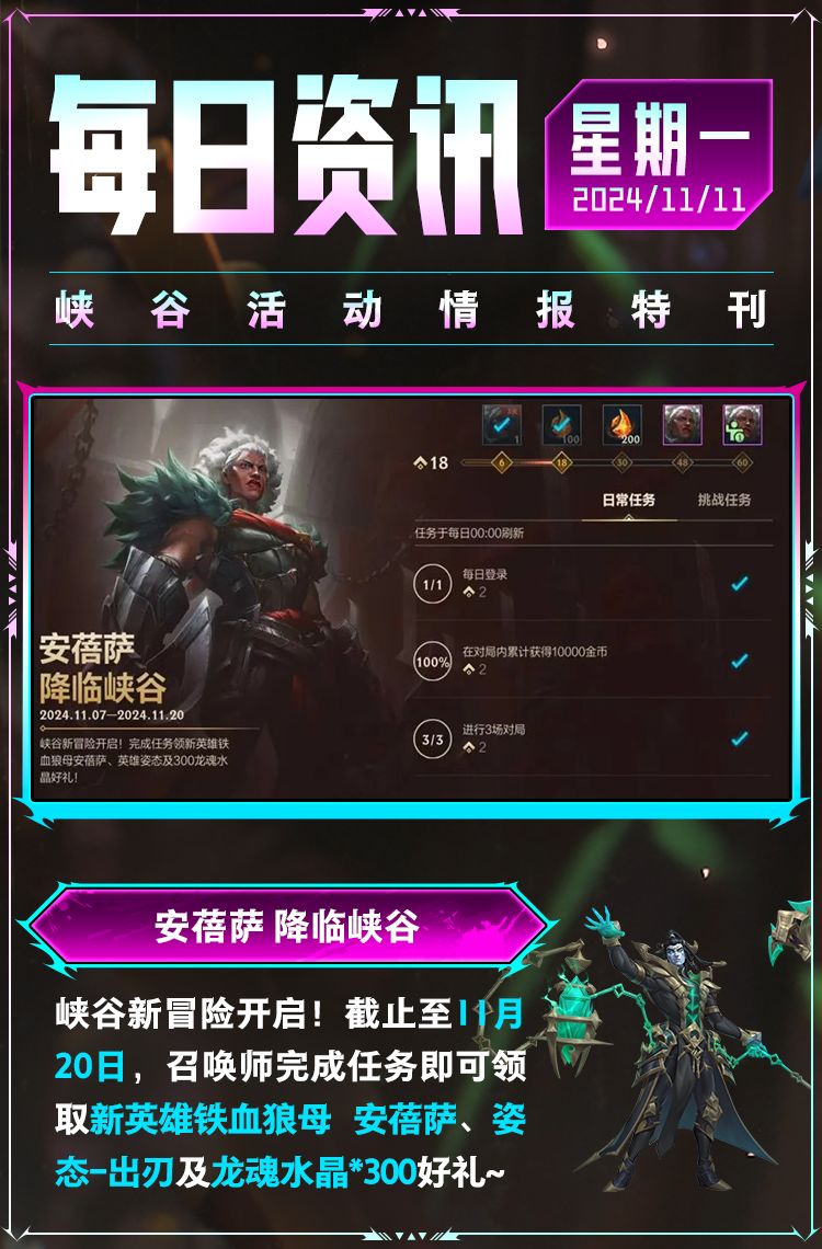 奖励:新英雄铁血狼母 安蓓萨,姿态-出刃,龙魂水晶*300