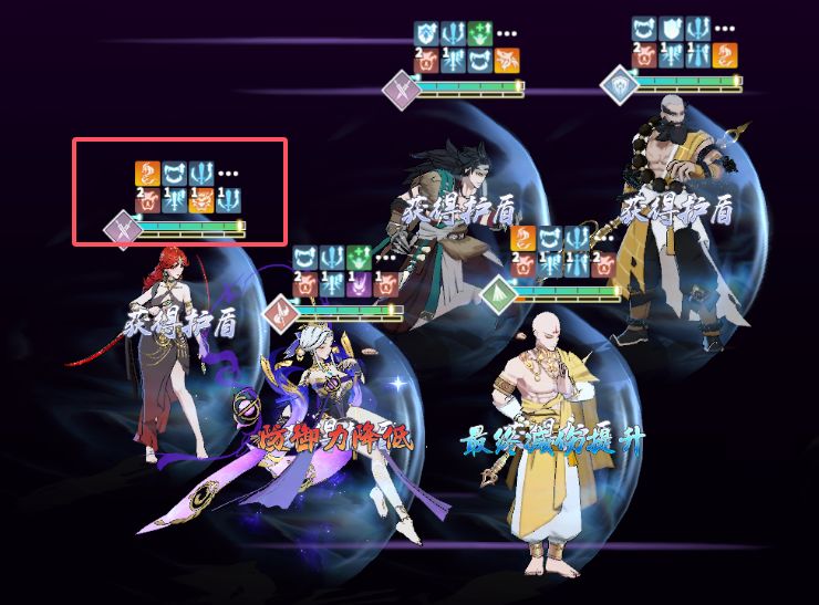 拥有护盾时受到攻击,有100%的基础概率使敌方全体怒气获取效率降低10%/25%(绝1/绝5),该效果持续1回合,不可叠加