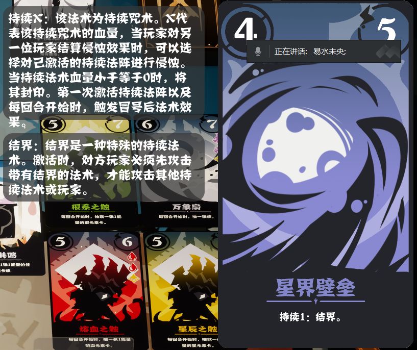 [结界]:结界是一种特殊的持续法术。激活时,对方玩家必须先攻击带有结界的法术,才能攻击其他持续法术或玩家。