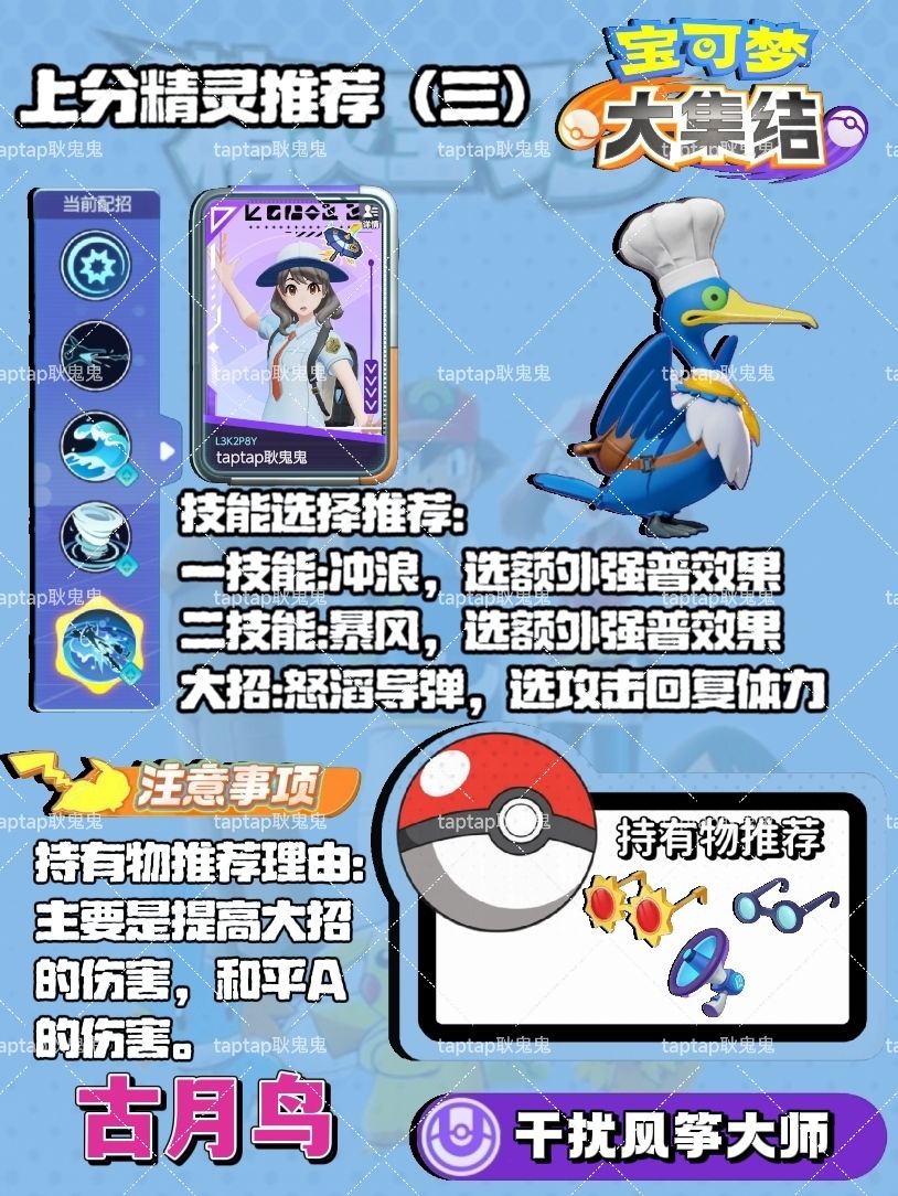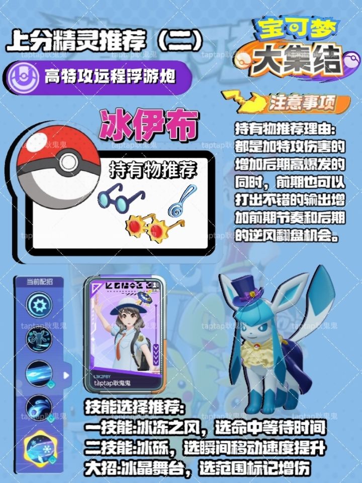 推荐理由是:伊布家族可以说都有点离谱,只所以冰伊布是因为它的技能有点向浮游炮可以追踪,然后大招类似英雄联盟的刀妹大招,那么参团的同时可以单方面打出不错的伤害,后期可以说都是神仙打架也是那么伤害非常缺乏的时候,能一波是解决不了问题的,能快速打败闪电鸟才是关键❗