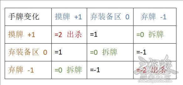 所以每个人都有三种情况,+1表示摸牌,0表示弃置装备牌,-1表示弃牌。所以形成的效果如下图。而两人场上没有装备的话,就只有四种组合。