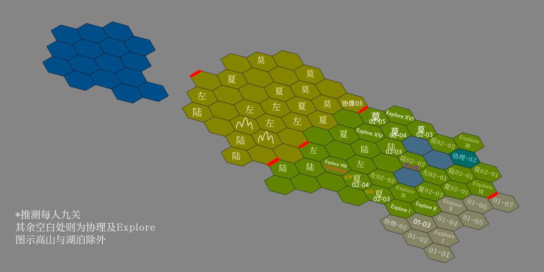 根据每个地块解锁所需材料初步推断的各男主地块如图所示,每位男主共9个地块,其余空白处则为协理或EXPLORE。