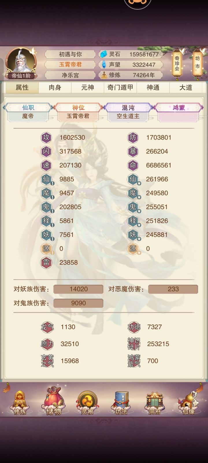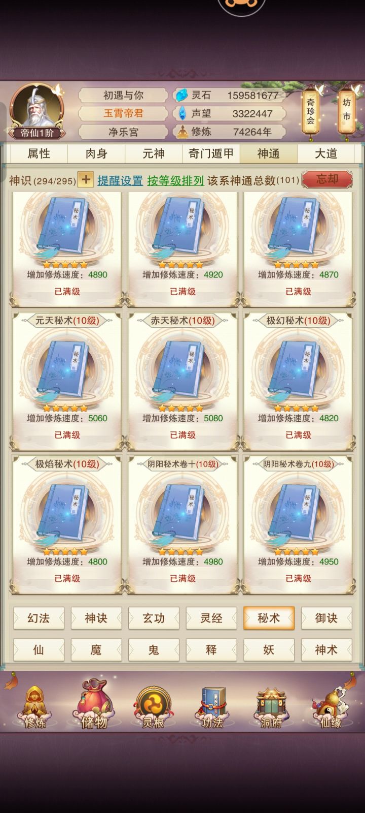 目前236万一跳,准圣目前预计计算10.4万年,实际会更快,走的修为流,属性偏低,高级先天都优先升10级神通秘术,天外天秘术还剩三本没买,帝君秘籍还差最后一本,八万年开始就能全力属性了