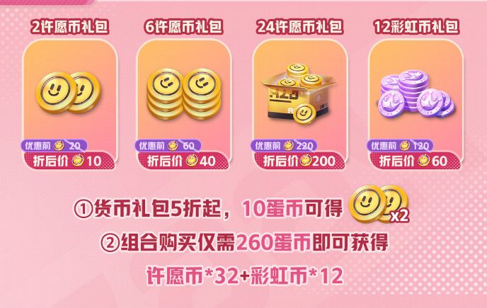 货币礼包大折扣!活动货币礼包最低五折起,仅需10蛋币即可互等2个笑脸币;若组合购买仅需260蛋币即可获得32个许愿币和12个彩虹币。折扣多多,优惠多多,快趁此机会拿下心选盲盒吧!