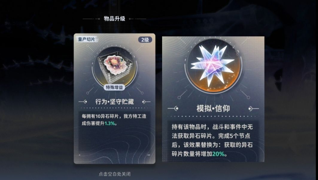 解析:每10碎片提升1.3%,到后期异石累加到2000-3000伤害直接爆炸💥,所以前期(1-2层)着重获取【行为.坚守贮藏】切片和异石碎片,为高难度boss打出高伤害奠定基础。