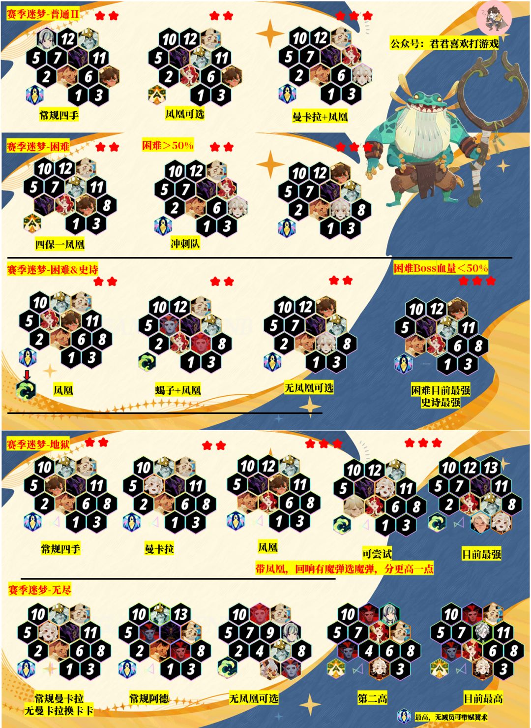 蛤蟆相对来说比较简单,只需要使用可复活的骨王来针对魔法泡泡就行。其他还是常规的群奶和伤害。奶量不足就补卡卡,足够就换输出。