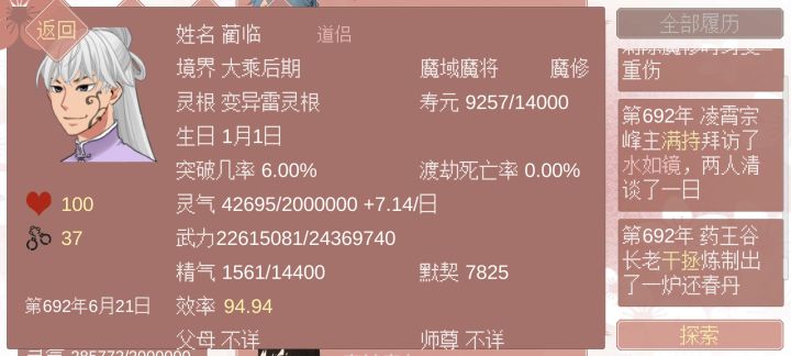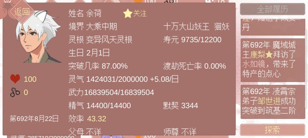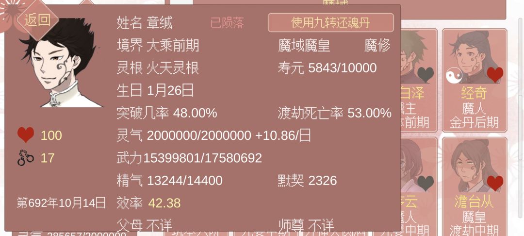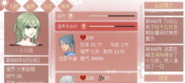 前期不太会玩,于是狂吸元阳给自己的技能升级……然后后面解锁了榜单,一下子被剑尊和妖王迷住(其实还有第一代魔尊……可惜后面渡劫失败陨落),然后开始有目的性地结识万剑山,魔域,还有十万大山的人哈哈哈哈哈哈