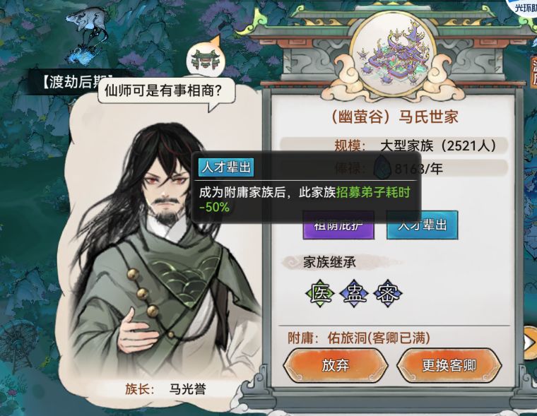 建议后期不需要追等级的时候,就把家族中,名门望族全部换成人才辈出。