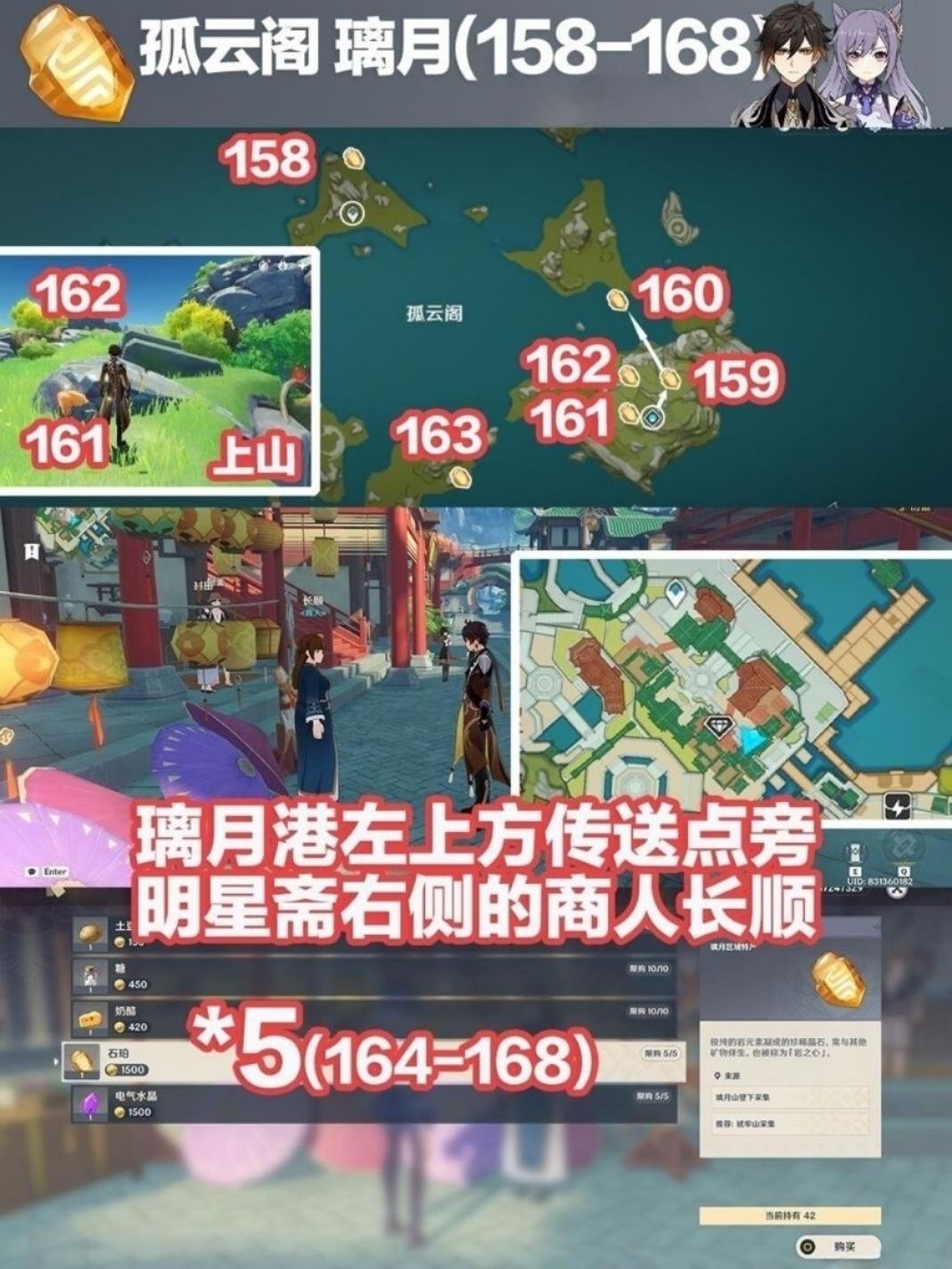 5.2下半,钟离就要复刻了,如果你有抽的打算,可以提前准备好石珀,这里是168个石珀的收集路线
