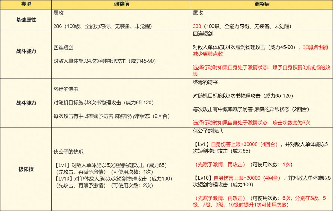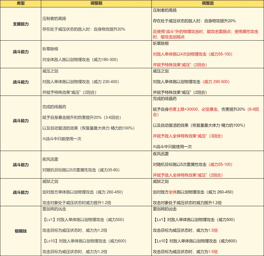 对本期追忆的霸者“赫尔米尼亚”进行了性能调整,详情如下: