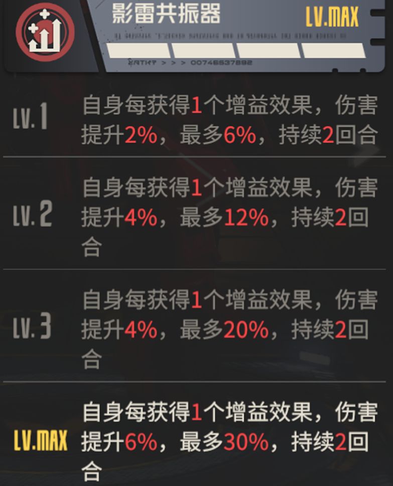 分解得到的影雷共振器是一个依靠增益效果数量获得增伤的模组,同时自身触发后也视为buff,对于一些能够与增益和buff数量产生联动的机师和机兵来说,是不错的搭配。