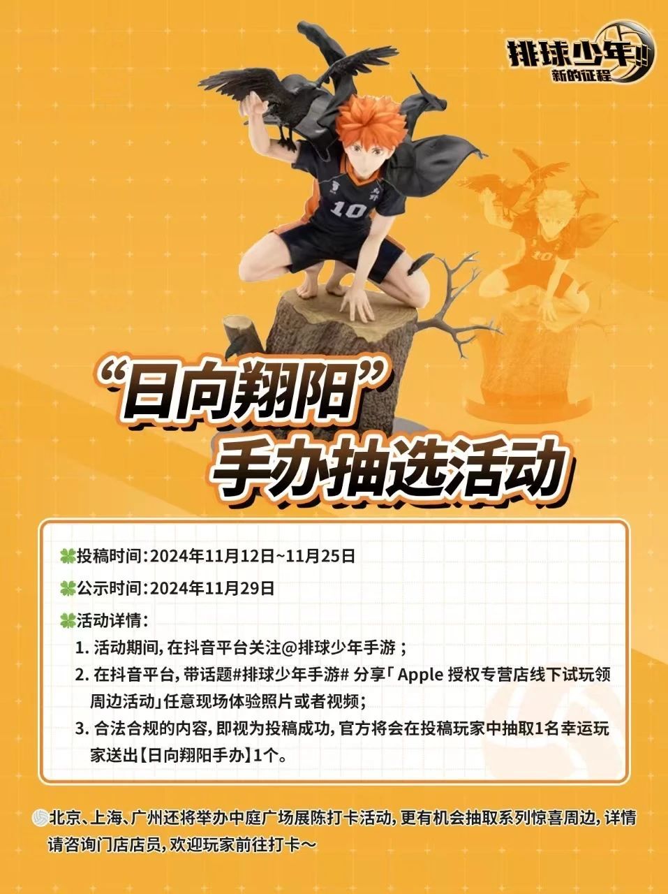 3. 合法合规的内容,即视为投稿成功,官方将会在投稿玩家中抽取1名幸运玩家送出【日向翔阳手办】1个。