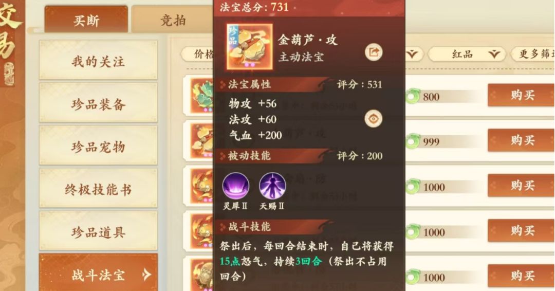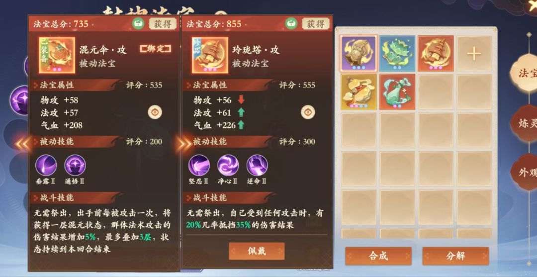 法宝篇:法宝是我受伤都地方,我都三卡浪费这的比较多,根据自己都情况来吧,优先红色,混元扇,塔。