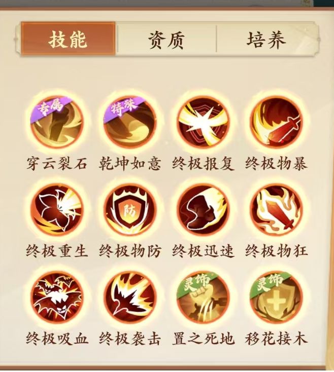 必选技能 天赐,收益最高,没有之一(刚开区拍都话,应该2000-4000玉,随着时间都推移,会降到几百玉)通悟、聚灵,这三个没有争议的好技能。其次备选招架、智力、坚忍、战意、逆命等属于锦上添花。前期没有红色,也可以用橙色过渡下。后期通过活动获取,慢慢往上合成。