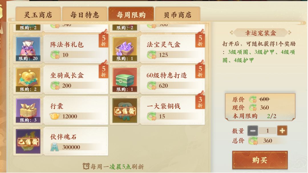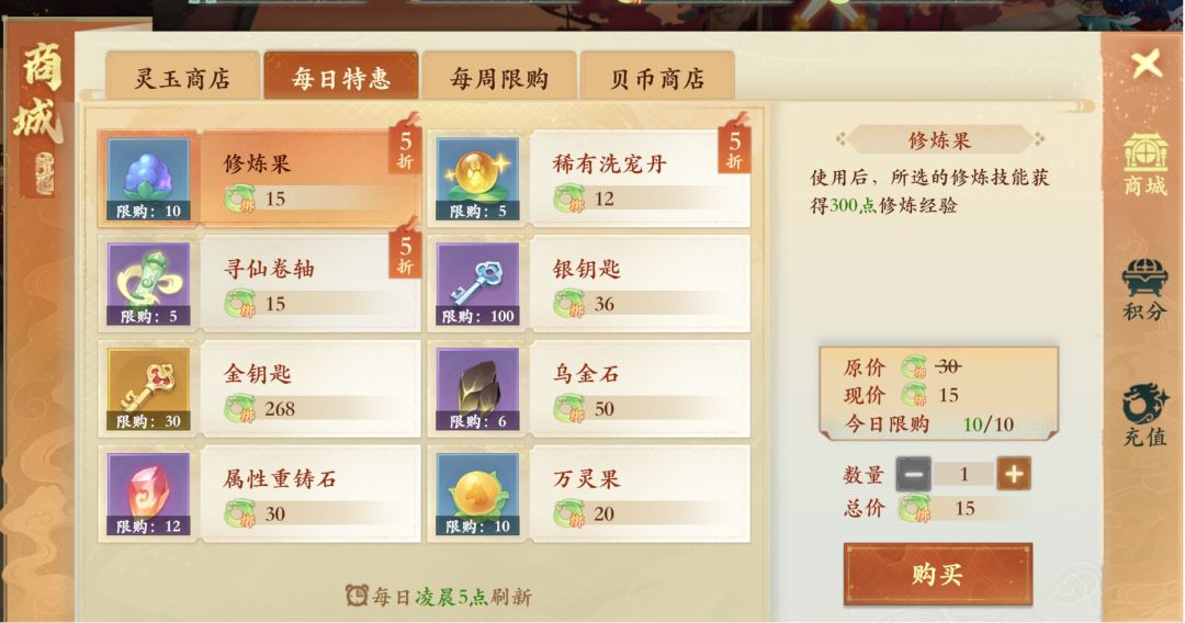 必买每周铜币15绑玉,50万铜币,如果用来点修,比上面修炼果都便宜。