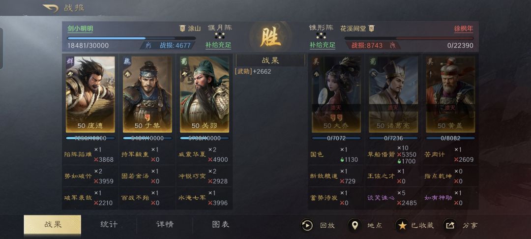 此番自己折腾的,就不做特别鸣谢了。关、庞、于三人摆出偃月阵,三回合就打崩了对面的大黄猪。正所谓不是冤家不聚头,他们的制胜思路,在我看来还是有一定分享借鉴价值的,故而全部整理到了下文的段落中。