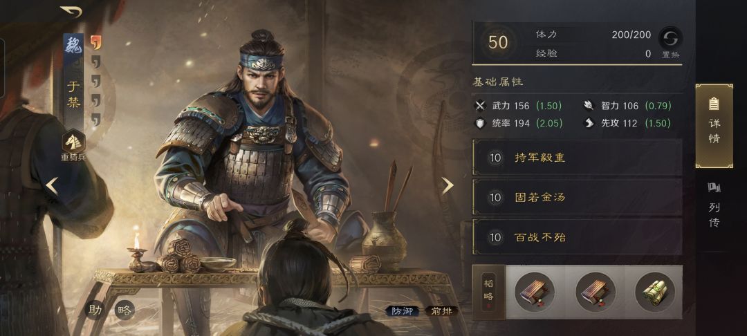 于禁战法:持军毅重+固若金汤+百战不殆。