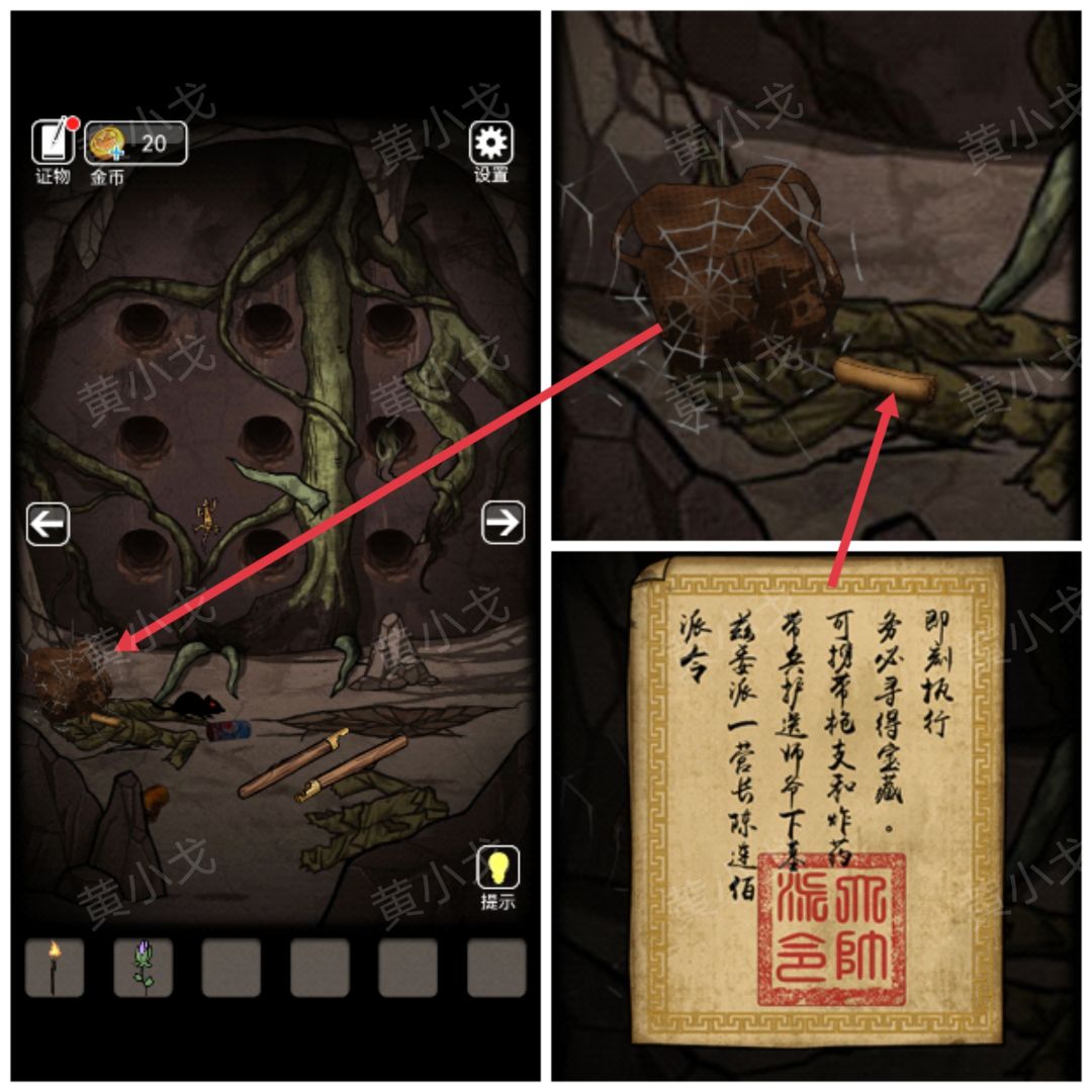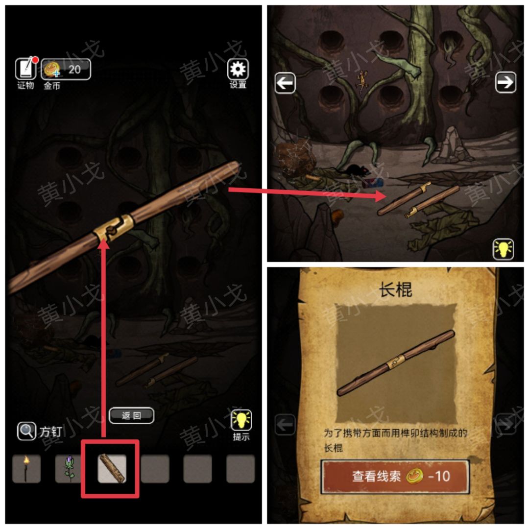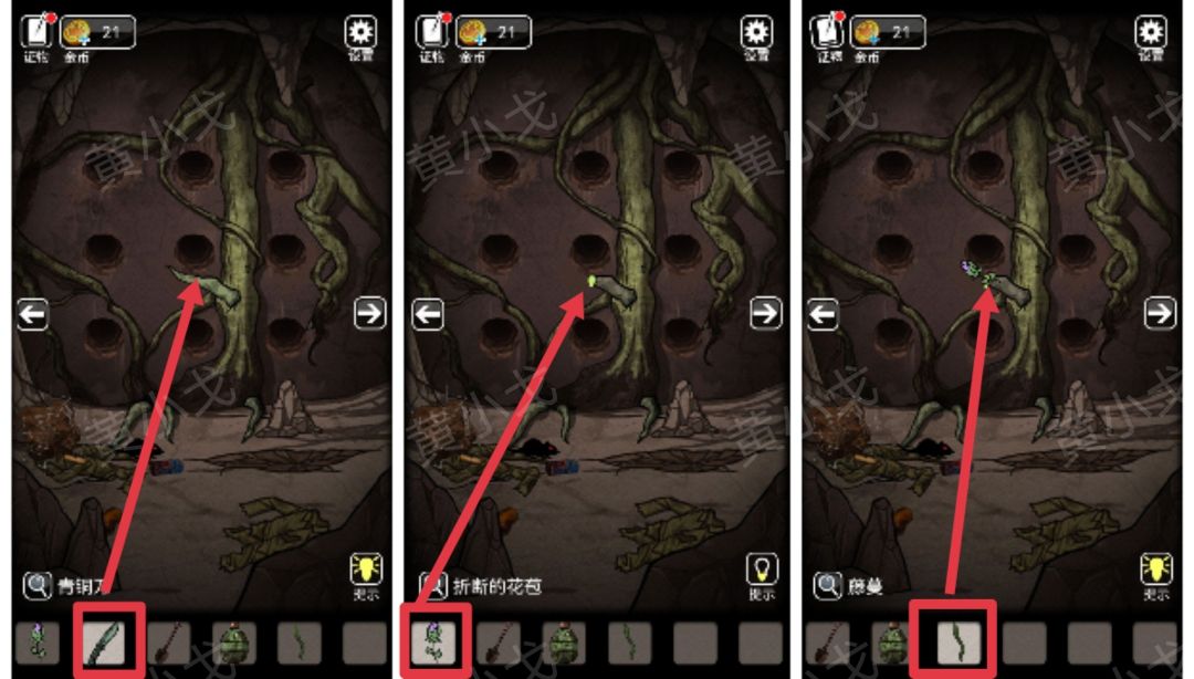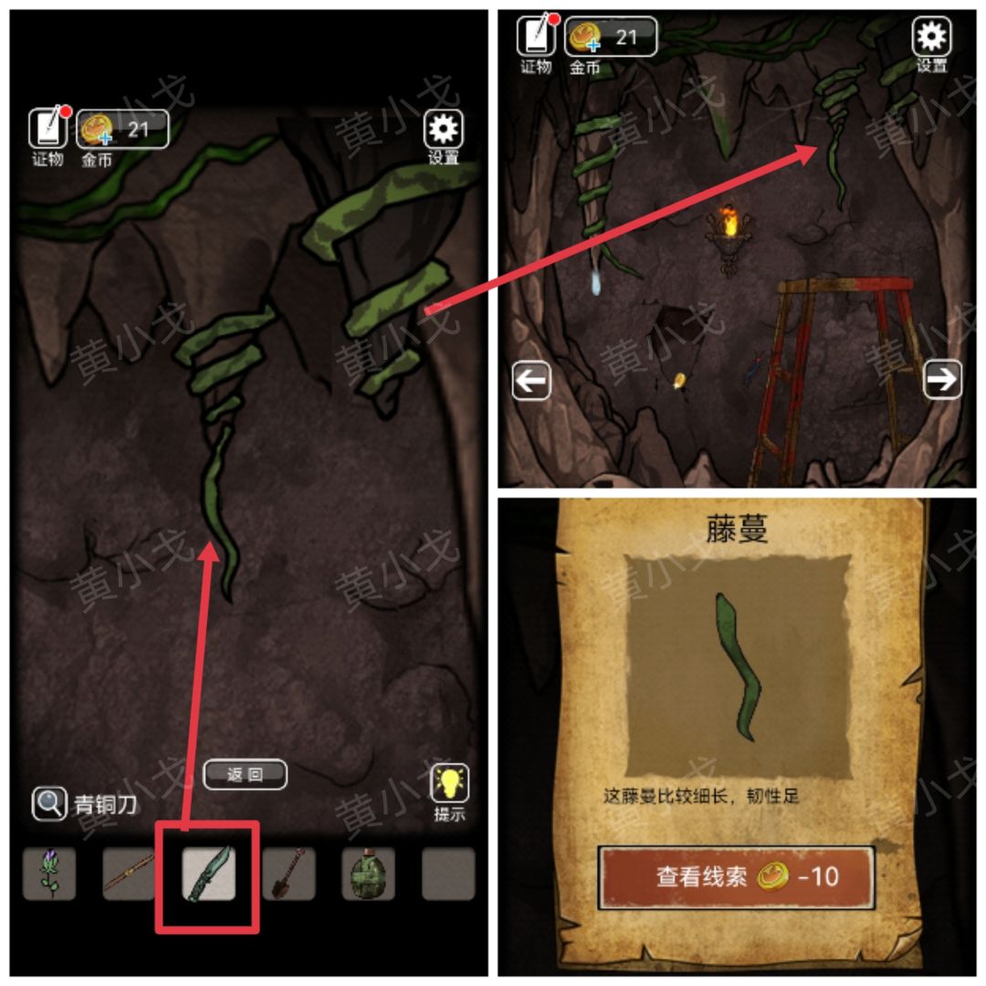 17.点击洞顶的藤蔓,用【青铜刀】割下一截【藤蔓】