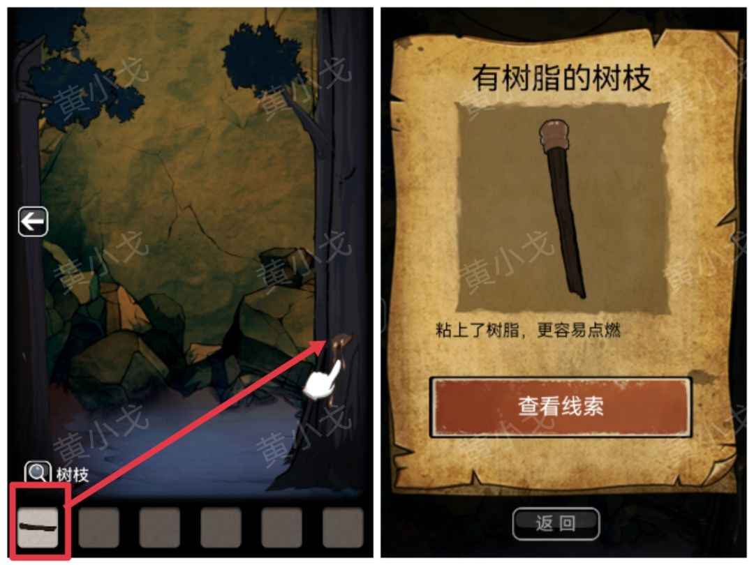 2.用【树枝】刮树上的树脂,获得【有树脂的树枝】